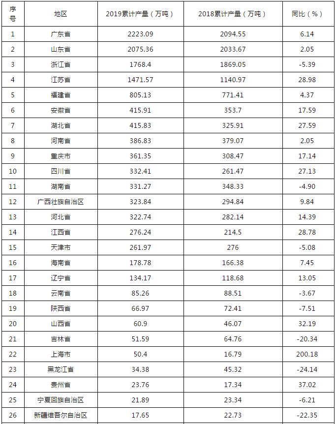 按行政区域划分,,,,,,,2019年,,,,,,,广东省实现产量2223.09万吨,,,,,,,同比增添6.14%,,,,,,,排名************,,,,,,,山东省2075.36万吨,,,,,,,同比增添2.05%,,,,,,,排名第二。。。。。。产量凌驾1000万吨的省份尚有浙江和江苏。。。。。。四个省份产量合计占到天下总产量的60%。。。。。。增速较量快的省份包括上海、贵州、山西、江西、湖北、江苏和四川。。。。。。