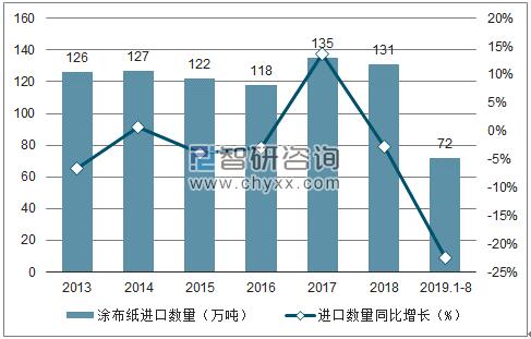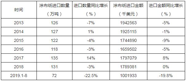 2019年1-8月中国涂布纸入口量为72万吨 同比下降22.5%