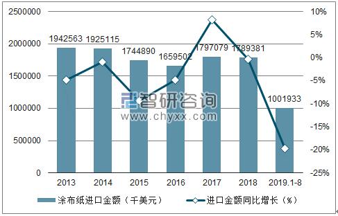 2013-2019年8月中国涂布纸入口数目及入口金额统计表